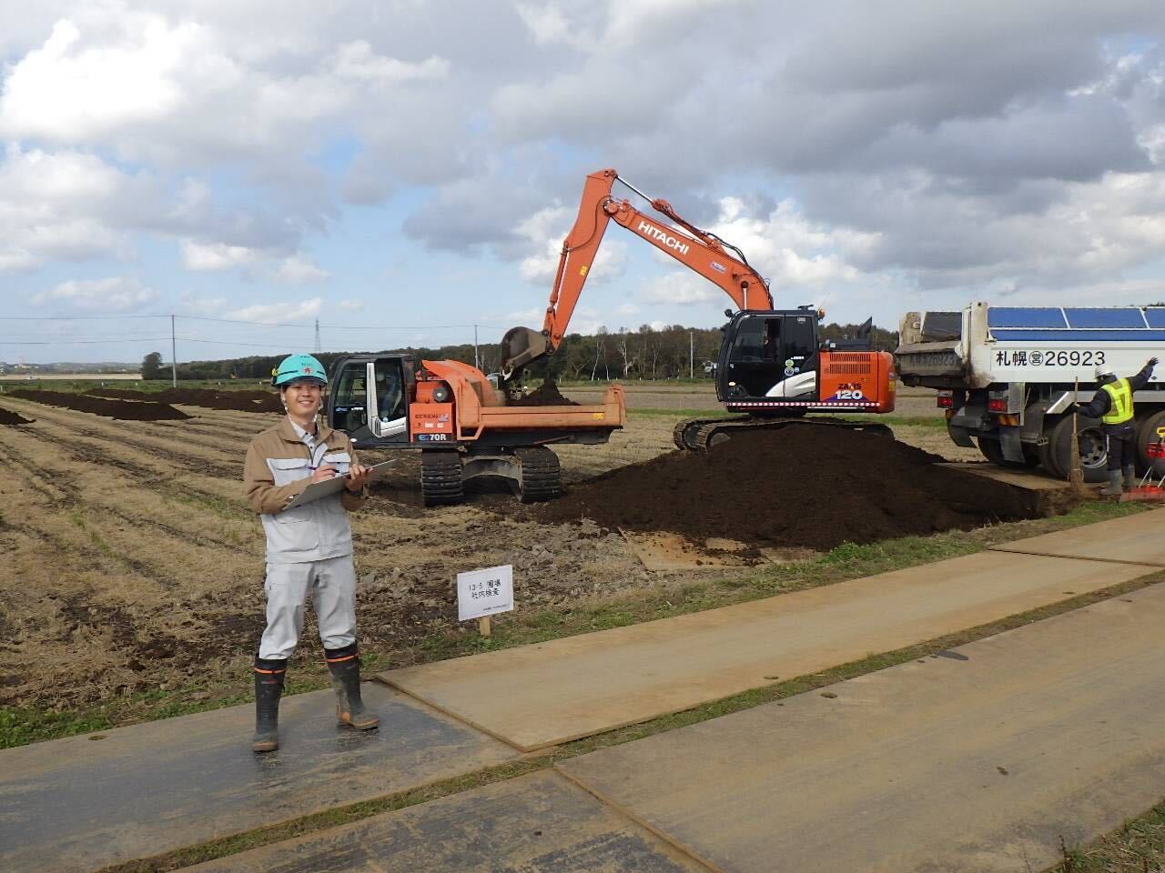 ↑農業土木工事で圃場に土を運んでいるところを監督している佐藤くん